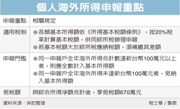 雖然海外獲利達到100萬元就該申報,官員表示,但其實基本所得還是有免稅額的設計,各類基本所得額最後要與綜合所得淨額合計,共可享免稅額670萬元,個人除非是炒股大戶,一般來說只要做好申報義務即可,所得金額在免稅額之內,不用怕額外課稅。
