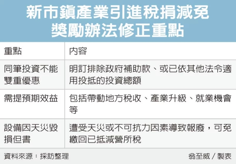 近年台商回流,為鼓勵企業投資新市鎮,內政部近日預告修正《新市鎮產業引進稅捐減免獎勵辦法》,參考過往經驗讓法規更明確,主要有三重點,第一,同筆投資不能雙重優惠;第二是要求申請投資抵減的企業必須提出預期效益;第三,若投資設備機器因天災毀損,可免繳回原先抵減的營所稅。