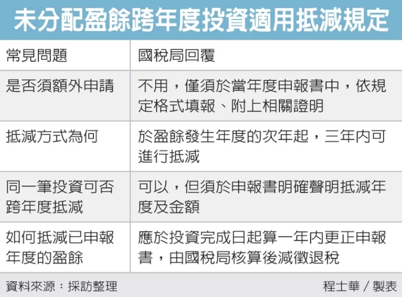 現行許多投資抵減措施,須額外申請、選擇抵減方式,官員說,未分配盈餘沒這麼麻煩,這項投資是從2018年度的盈餘開始適用,只要在盈餘發生年度的次年起三年內,符合標準的投資都可以適用,而且只要在報稅時依格式填報、檢附相關投資證明文件即可。