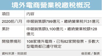財政部官員表示,從2017年5月境外電商課稅制度上路以來,統計至8月底,合計申報銷售額達3,100億元,繳納營業稅額128億元。