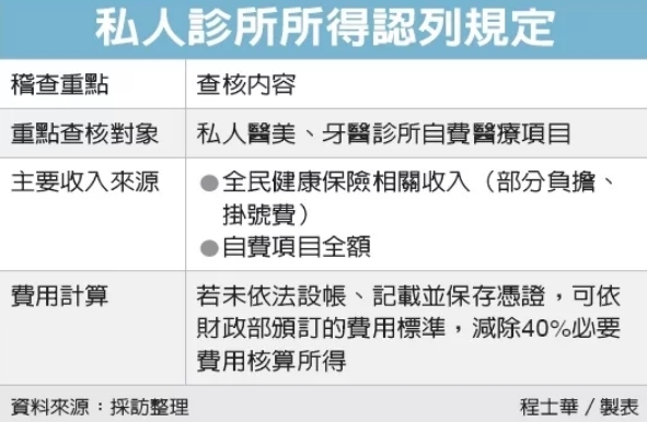 相對於公立醫療院所,台北國稅局表示,私人執業的診所,特別是醫美及牙醫診所,都是國稅局重點查核的對象,非健保給付的自費項目,即便未設帳核算成本費用,也可依部頒標準減除40%必要費用;但若業者短漏報所得,則會面臨高額補稅加罰。