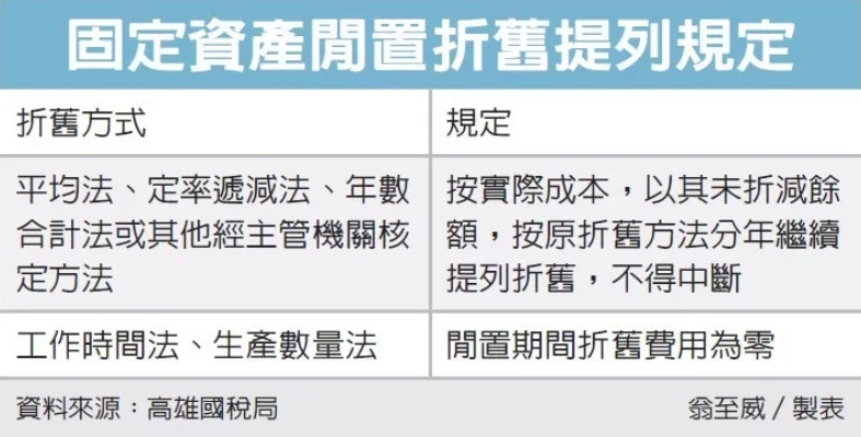 財政部高雄國稅局表示,公司的固定資產,若因停業未供營業上使用而閒置,根據《營利事業所得稅查核準則》規定,除非折舊方法採「工作時間法」或「生產數量法」外,否則仍應繼續提列折舊,折舊數額則依照固定資產性質,列報為當期營業費用或營業成本。