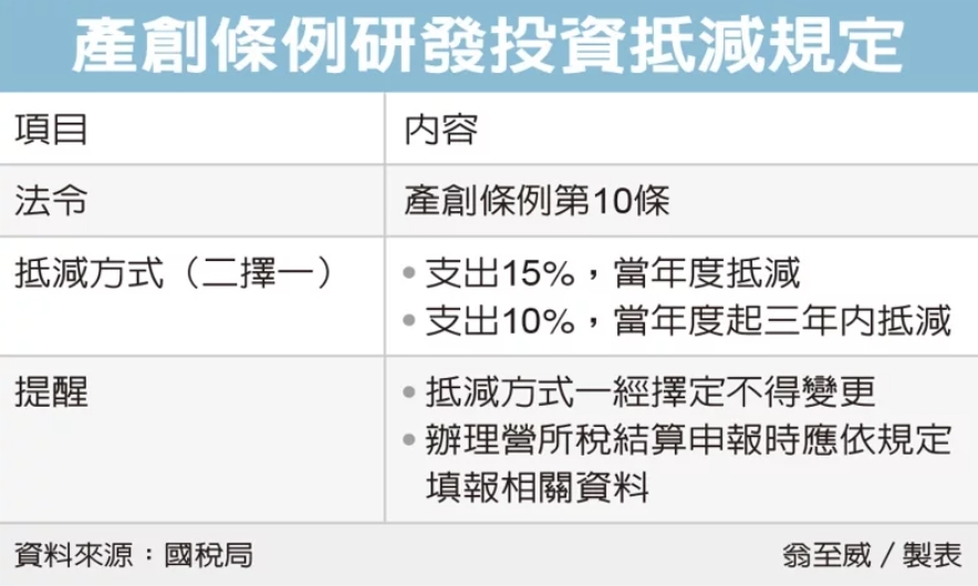 《產業創新條例》、《中小企業發展條例》都提供研究發展支出投資抵減,財政部台北國稅局提醒企業,當年度投資研發支出,可在兩種抵減方式中二擇一,第一是支出金額15%內,抵減當年度營利事業所得稅;第二是在支出金額10%內,自當年度起三年內抵減各年度營所稅。