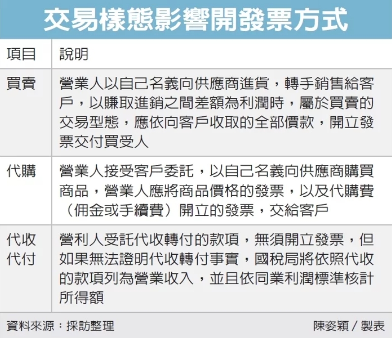 國稅局官員說明,網路交易樣態可分為買賣、代購、代收代付三種類型,而不同的交易樣態會影響開立發票的方式。官員說明,營業人以自己名義向供應商進貨,轉手銷售給客戶,以賺取進銷之間差額為利潤時,屬於買賣的交易型態,應依向客戶收取的全部價款,開立發票交付買受人。舉例:營業人甲先生以80元向供應商乙進貨,轉手以100元價格賣給客戶A,此時甲先生應依收取價款100元,開立發票並交付給A,且開立發票的金額,應包含營業稅。