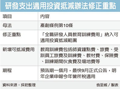 根據草案,專門從事研發工作的全職人員參與研發相關的教育訓練費用,可納入投資抵減範圍,而所謂教育訓練,包括自辦、委辦、相關團體聯合辦理都算,但必須是全職研發人員參與、提升研發技術或專業能力才可;可申請抵減的費用包括師資鐘點費、旅費、受訓員工旅費及訓練費等。