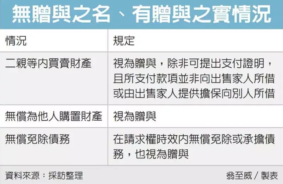 首先是二親等內親屬間財產買賣,將被視為贈與。除非能提出實際支付款項證明,且所支付的款項,不是向出售的家人借錢,或出售財產的家人提供擔保向別人所借的錢,才不算贈與案件。