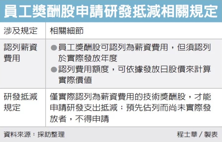 官員指出,企業聘雇專門從事研發工作的全職人員,其薪資費用其實可以作為研究發展支出而享用稅務優惠,其中獎酬員工的股份,雖然是權利性質的商品,不過還是可以用股價等資訊,來算出這筆獎酬股的公允價值,並在給付日按照它的實際價值,列為研發人員的薪資費用。